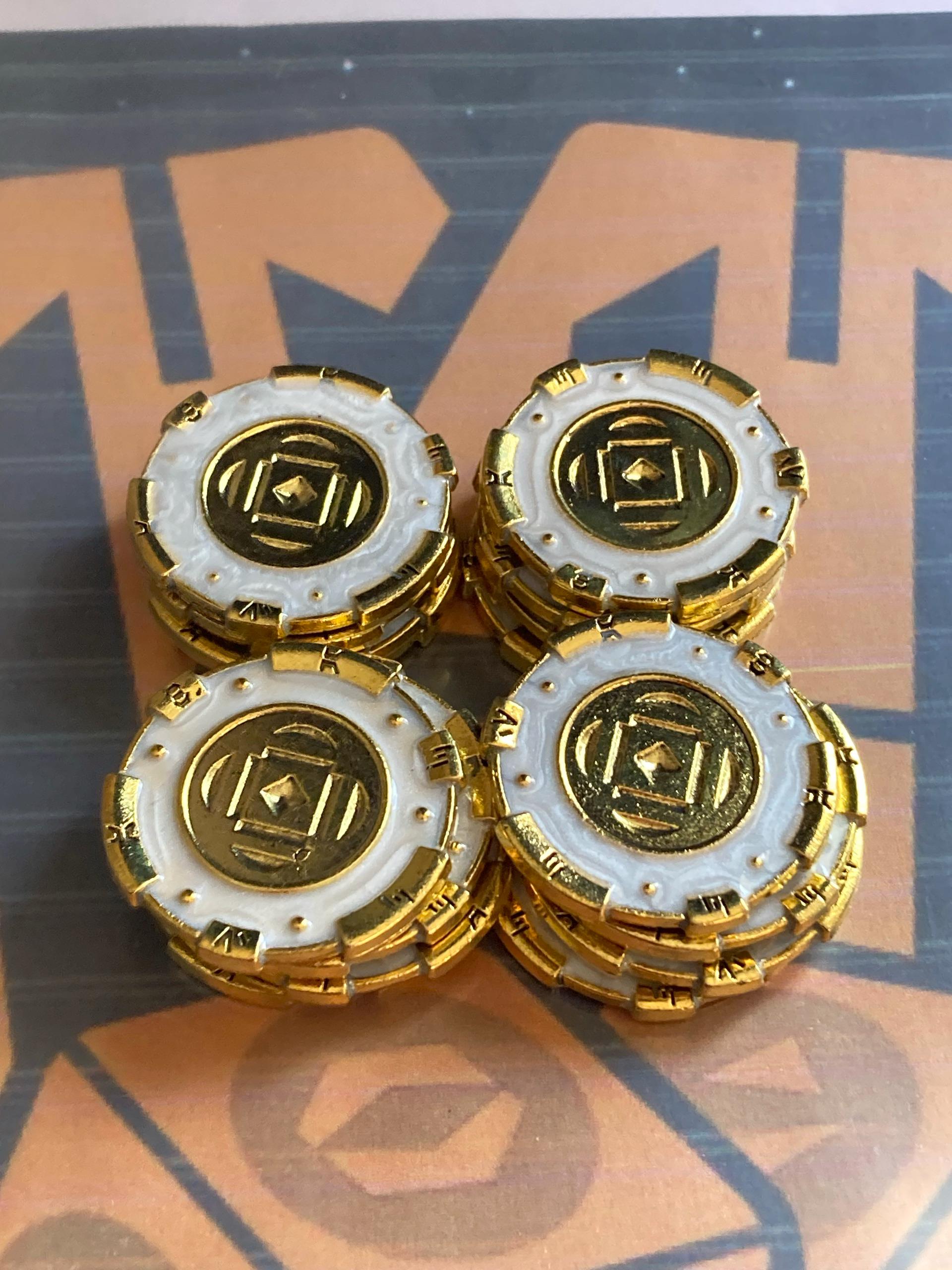 Martin AThese Kessel shift tokens are great. They are slightly smaller than other metal tokens on the market, but still a terrific size... Read MoreThese Kessel shift tokens are great. They are slightly smaller than other metal tokens on the market, but still a terrific size in the hand and on the table. Best of all, I can carry a handful of them everywhere I go with much less bulging bulk in my pocket. HidePosted on -