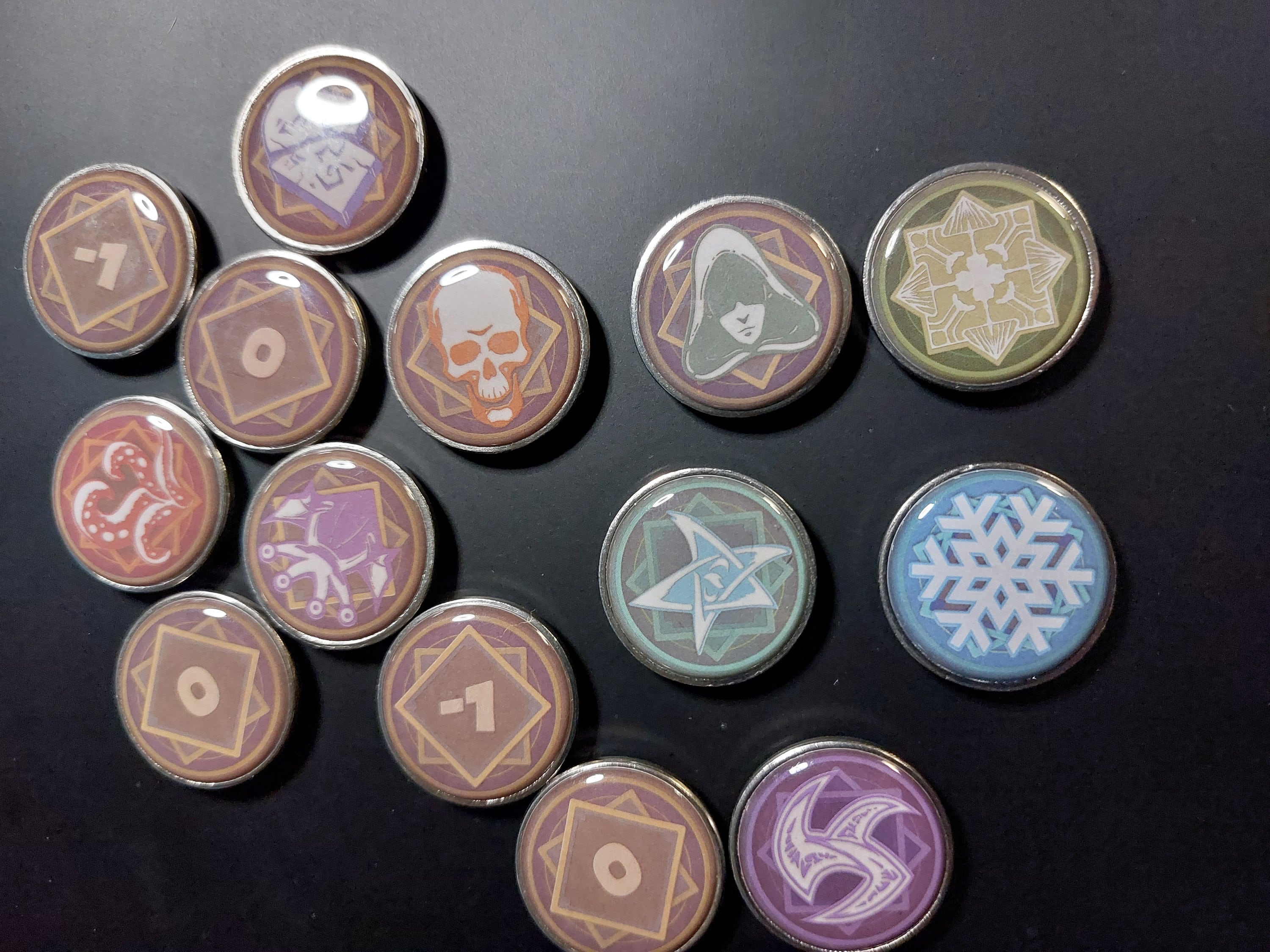 Excellent tokens, great quality, great price. Would have preferred a sharper color contrast though, the color palette gives the tokens a dark, muddy look. Love the feel and weight drawing them from the chaos bag!
